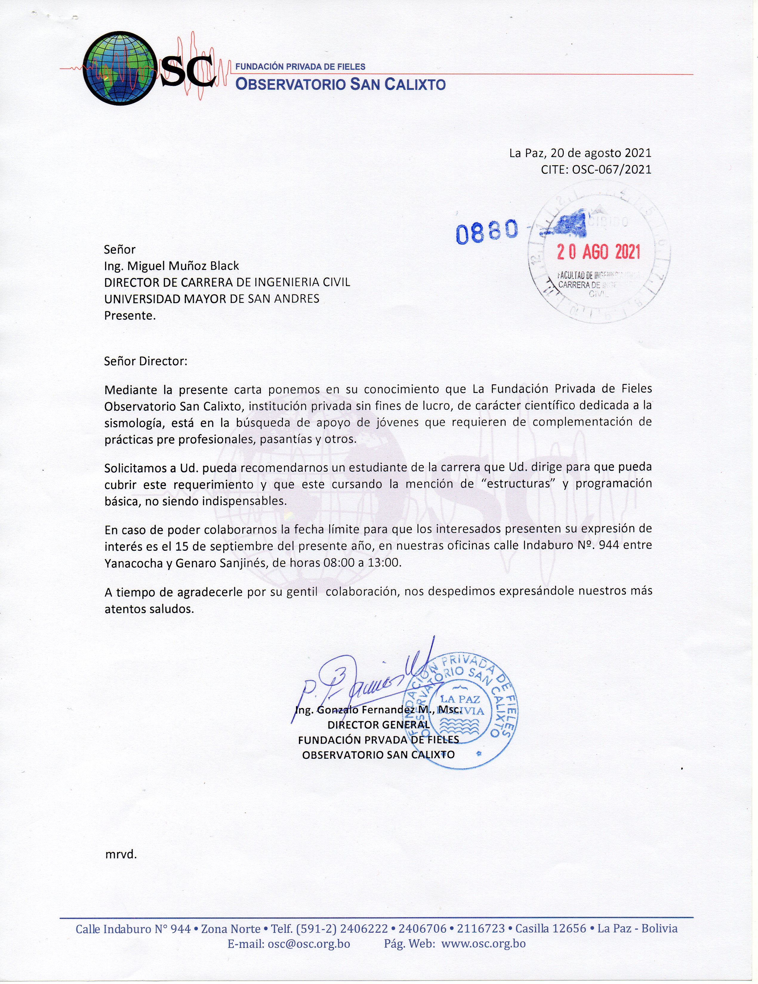 PASANTIAS EN LA FUNDACION PRIVADA DE FIELES "OBSERVATORIO SAN CALIXTO" - Ingeniería Civil